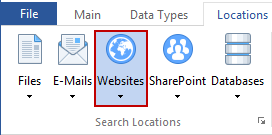 To view or modify Websites settings, click the Configuration ribbon, then the Settings button, then the Websites page. Alternatively you may click the Locations ribbon, then click the dropdown menu of the Websites button and select Customize Websites Settings. For additional information on Websites settings please refer to View and Manage Websites to Search.