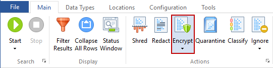 The Encrypt button is located on the Main ribbon and is enabled for certain file types. When Spirion locates a Data Match in any of the following location types, you will be able use the Encrypt feature with encryption to protect your data: