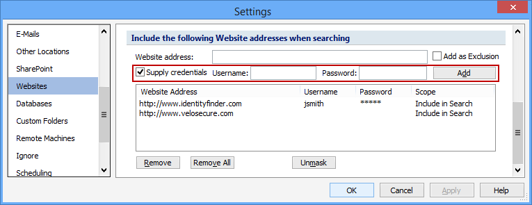 The Supply Credentials setting allows you to search a website that requires a username and password. To allowSpirion to authenticate, click the Supply Credentials checkbox and enter a Username and Password. Then click the Add button for that website. If you want to hide or mask the passwords you entered, click the Mask button. To reveal the passwords again, click the Unmask button. Click Remove to remove a selected website address and click Remove All to remove all the websites added for search.