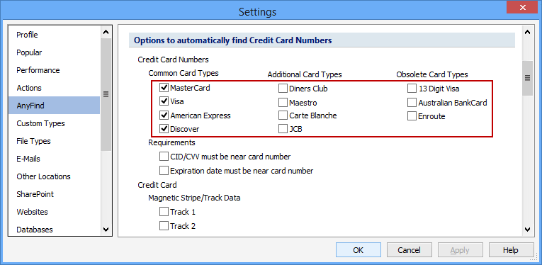 The Options to automatically find Credit Card Numbers setting allows you to search for specific card types.