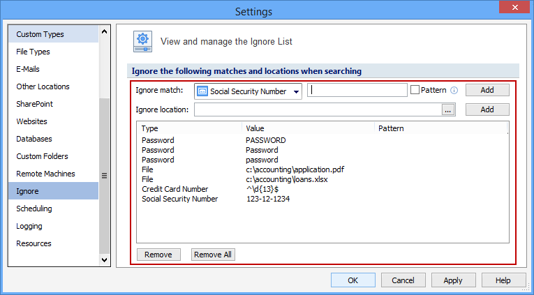 The Ignore the Following Matches and Locations When Searching feature allows you to manually provide specific personal information, patterns (Regular Expressions) that match personal information, or specific file locations to exclude from searches. For example, Sensitive Data Manager may uncover a sample credit card number inside a temporary Internet file or a public password that you do not want to secure. Additionally, if you want to exclude a single file from all searches, this is the only way to do so within Sensitive Data Manager. The Ignore List can contain a list of Locations on your computer and Data Types. This is similar to an approved exceptions list because Sensitive Data Manager never reports results if they are in your Ignore List. You can securely save this information across sessions of Sensitive Data Manager within your Profile.