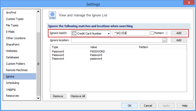 To add a pattern to ignore, select the Data Type from the Ignore Match dropdown box. Then enter the pattern in the field to its right. Then check the Pattern checkbox and click Add. The Pattern checkbox allows you to use a Regular Expression to match search results rather than matching a specific value as above. For example, if you have sample forms on your computer that use many different placeholders for completing Social Security forms, but they all begin with 123-12, you could add the pattern ^123\-12 as a Social Security Number pattern and prevent them from being displayed in the search results.