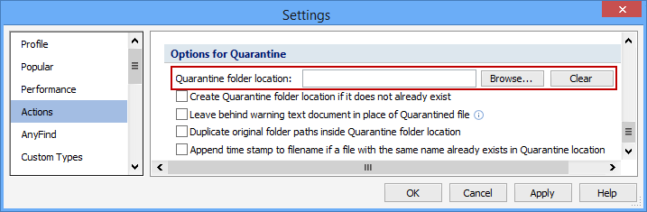 The Quarantine Folder Location setting specifies where the default location for a file you decide to quarantine will be securely moved. This location should be a secure folder on your computer, such as an encrypted drive or one to which unauthorized individuals cannot gain access.
