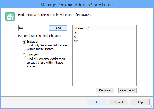 To manage which states are filtered, press the Manage button and the Manage Personal Address State Filters dialog will pop up. Select the states from the dropdown list and press the Add button. When the list is complete you can choose whether Spirion will Include all those states in its requirement or Exclude all those states. By default, the list is an Include list but choose the radio button you prefer. When finished press OK.