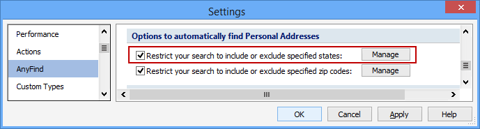The Restrict Your Search to Include or Exclude Specified States setting allows you to filter which states Spirion will search for Personal Addresses. By default, Spirion will find any but you can either require your range to include specific states or exclude specific states.