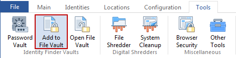 The Add to File Vault tool allows you to securely store your documents with a password and encryption. To use this tool click the Add to File Vault button on the Tools ribbon.