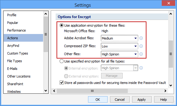 The Use Application Encryption for these Files setting allows you to specify how Spirion encrypts common file types when you use the Secure action. If you choose to use application encryption there are three file types and a fourth catch-all file type that you can configure. Each has one or more options: