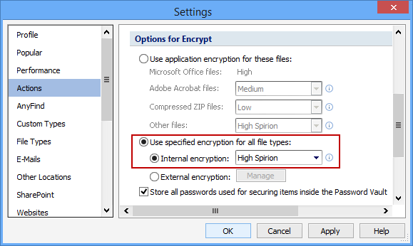 The Internal Encryption setting for Using Specified Encryption for All File Types allows you to bypass Using Application Encryption for Securing Files and always use Spirion's internal encryption procedures. Some users find this useful because they do not like other application's encryption or need to use an encryption such as Spirion's that is strong (256-bit AES) or has been FIPS 140-2 validated. The following options are available for internal encryption but High Spirion is the default: