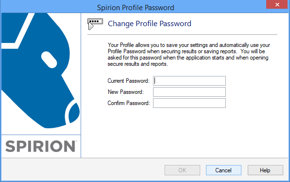 To Change Your Profile Password first sign into your profile, then click the Change button and the Spirion Profile Password dialog will pop up. Here, you must enter your current password. Then, enter the new password and complete by confirming the new password. When finished, press OK. You can click Cancel if you wish to keep your current password.