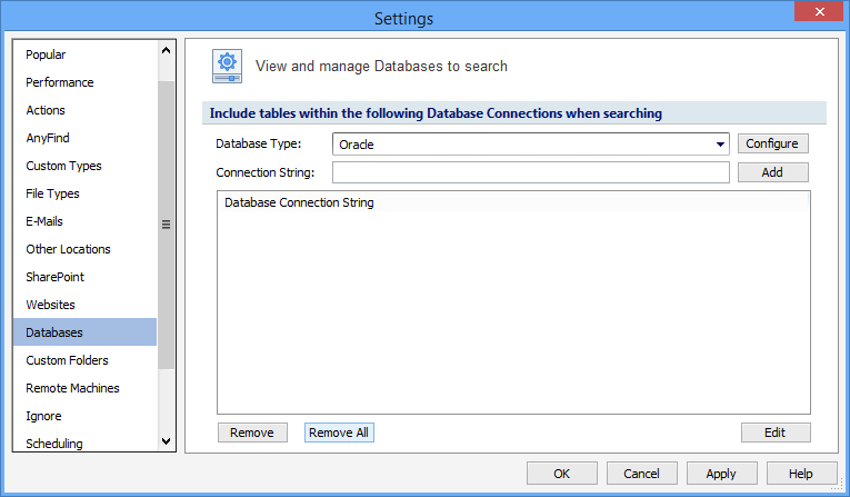 The Databases Settings pages allow you to view and manage databases to search. To open or modify these settings, click the Configuration ribbon, then click the Settings button, then select the Databases page. The Database Connection String list includes the list of all Databases to be searched. You can add multiple Database Connections and Sensitive Data Manager will search each one.