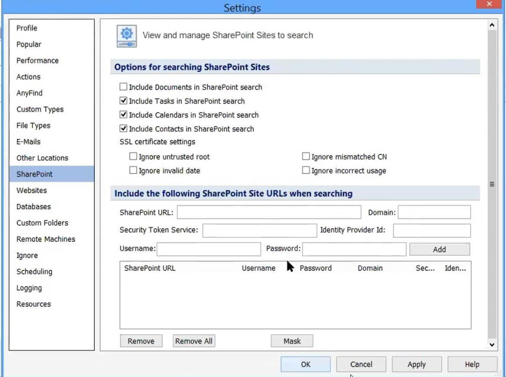 The SharePoint Settings page allows you to view and manage SharePoint sites to search. To open or modify these settings, select the Configuration item on the ribbon bar, then click the Settings button, then select the SharePoint page.