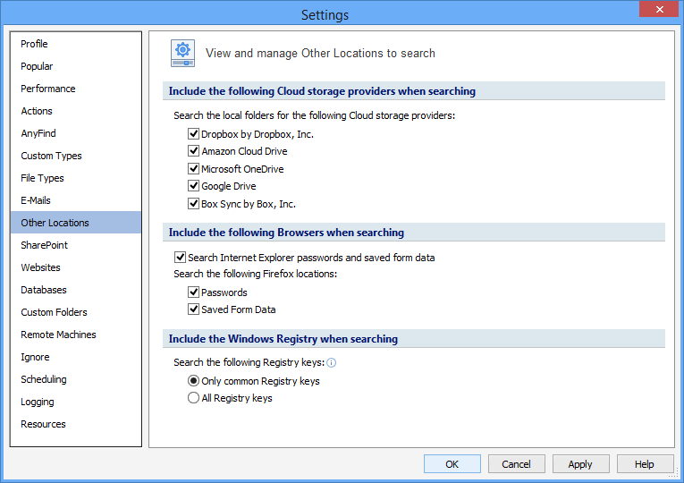The Other Locations Settings page allow you to view and manage Cloud storage folders to search. To open or modify these settings, click the Configuration ribbon, then click the Settings button, then select the Other Locations page.