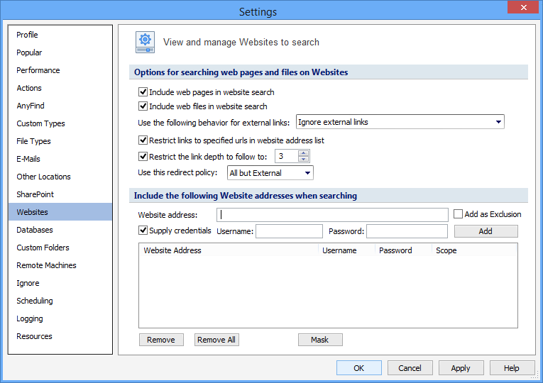 The Websites Settings pages allow you to view and manage websites to search. To open or modify these settings, click the Configuration ribbon, then click the Settings button, then select the Websites page.