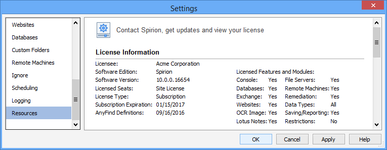 To view or modify this setting, click the Configuration ribbon, then the Settings button and then select the Resources page. For additional settings please refer to Contact Spirion, Get Updates and View Your License or Settings to Customize Your Experience.