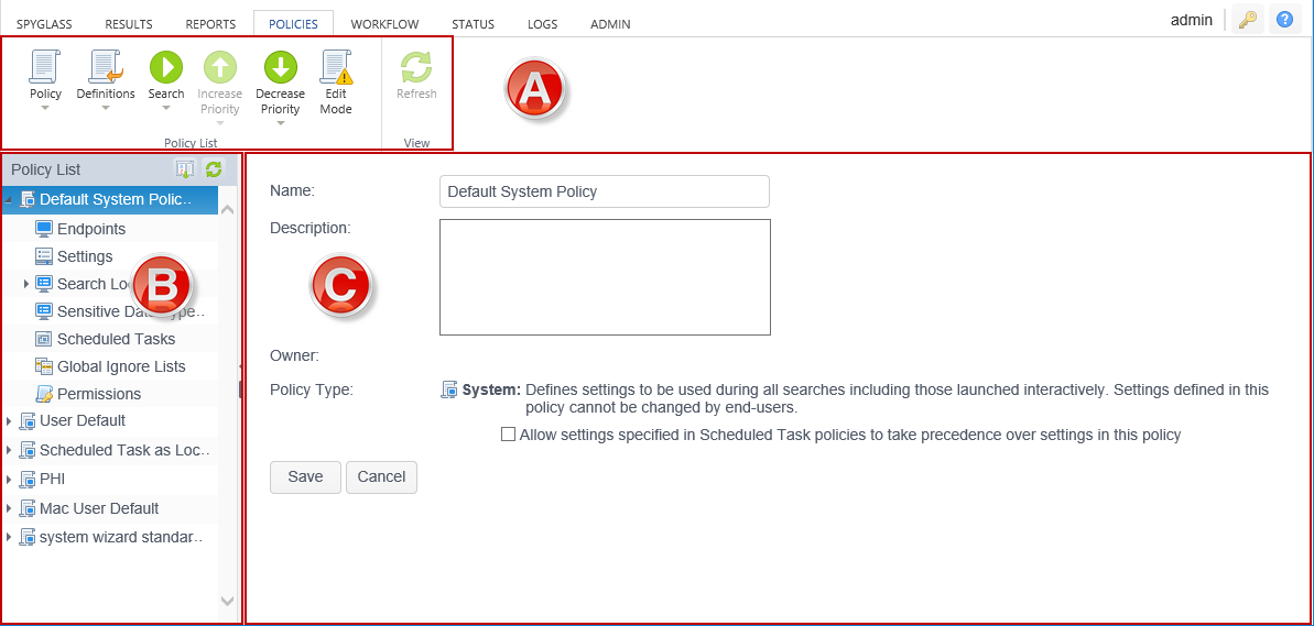 - Policy List: Displays and allows management of the list of policies, including setting policy priority.