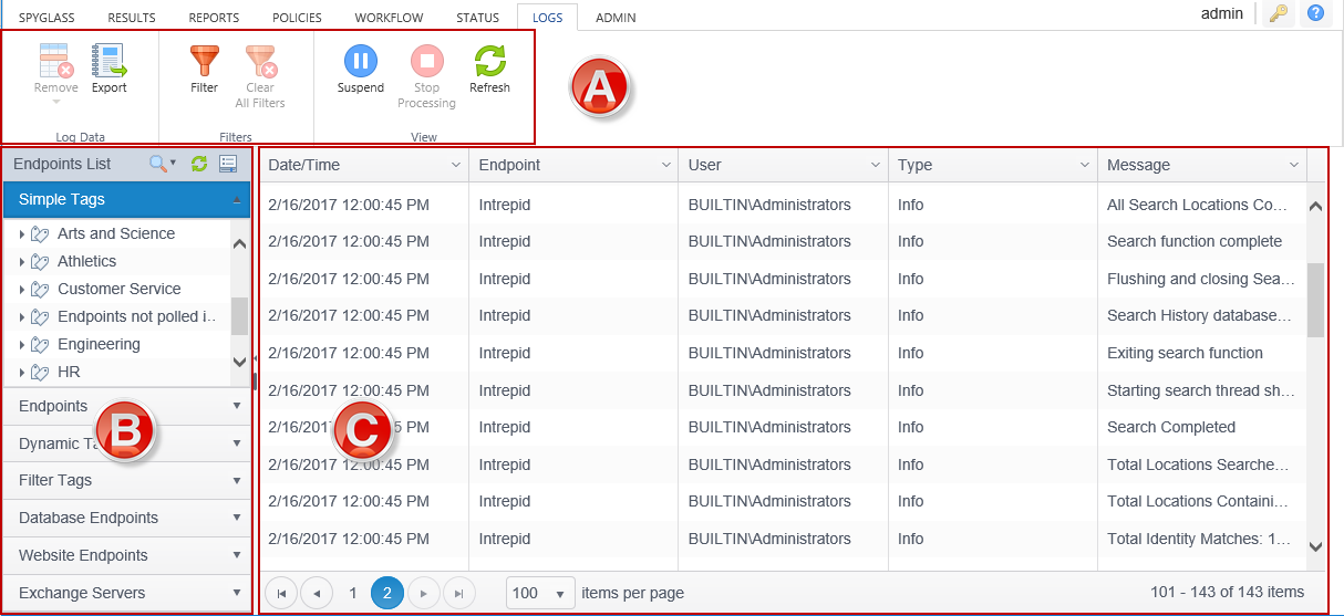 - Ribbon Groups: Used to delete and export log information, and to apply filters.