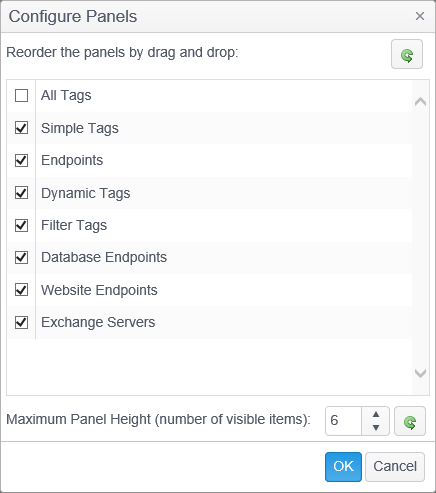 To reorder the panels, left click on a panel and drag and drop it above or below another panel. To reset the panels back to their default order, press the green reset button in the upper right corner of the Configure Panels window.