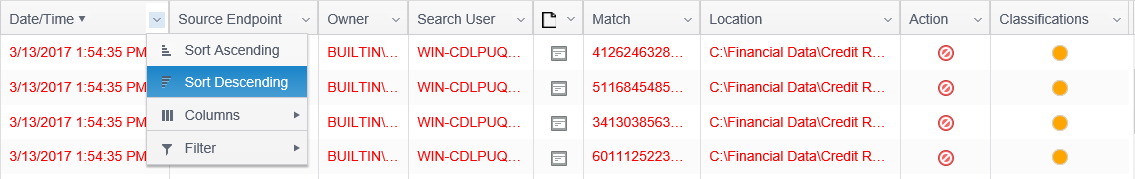 - Data Type: A filter which restricts based upon the data type. (SSN, CCN, phone number, etc.). An icon representing the type of the result with a tool tip detailing the type. For example, this column displays an icon of the Social Security Number AnyFind type as displayed in the endpoint user interface with a tool tip of "Social Security Number" that displays when you hover over the icon with the mouse.