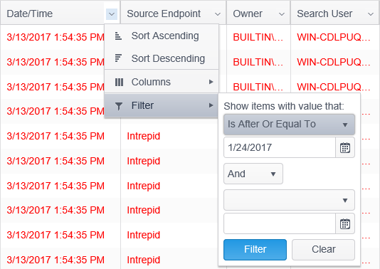 Filtering by column provides the ability to restrict the Results View to only display information that matches the specified, custom criteria. Multiple filters can be applied at once and the column filters are independent of any filters applied via the filter button in the Filters group, though in many cases the same filter can be applied by either method. To open the filter for any column, click on the filter icon on the column header. When a column is being filtered, the filter icon appears filled.