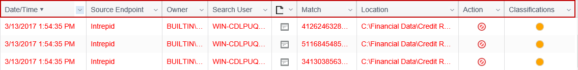 - Action: An icon representing the most recent action performed on the result. This action may have been initiated on the endpoint or via the Console. If no action was taken, a red circle with a line through it is displayed. The other possible actions are Ignore, Quarantine, Recycle, Redact, Encrypt and Shred. Hovering over the icon with the mouse reveals a tooltip with the action name.