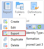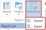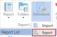 To export report definitions to an xml file, highlight the report name of the report to be exported and then select Export.