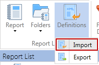 To import report definitions from an xml file and add the specified reports to the Report List, select Import.