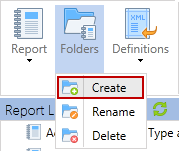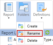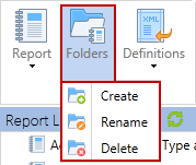 To make finding reports easier, they can be organized within folders through the use of the Folders button. The Folders button provides the ability to create, rename and delete report folders. Report folders are only for visual organization purposes and do not have any effect on permissions, relationships, or any other function of the reports themselves.