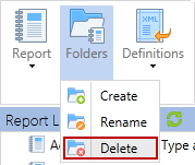 To delete an existing folder, click on the folder, click the Folders button and select Delete. All subfolders are also deleted, but any reports within those folders are not deleted. The reports from within a deleted folder are moved to the root level. Because folders are only for visual organization, deleting folders does not affect any relationships established within reports themselves.