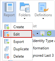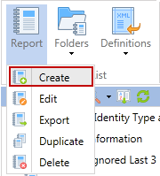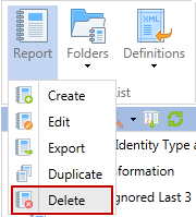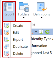 The Report button provides the ability to create, edit, export, duplicate or delete a report.