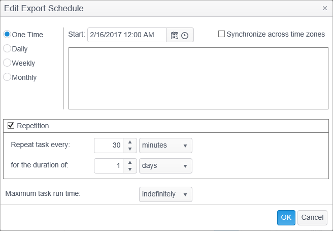 - Start: Date/Time: Specify the earliest time and date that the task can execute. The time is local to the client (unless "Synchronize across time zones" is selected). If the time is 12:00 PM, the task will execute at noon locally on every associated endpoint - that is, the task will execute at noon for an endpoint in New York and at noon (3PM EST) for an endpoint in San Francisco.
