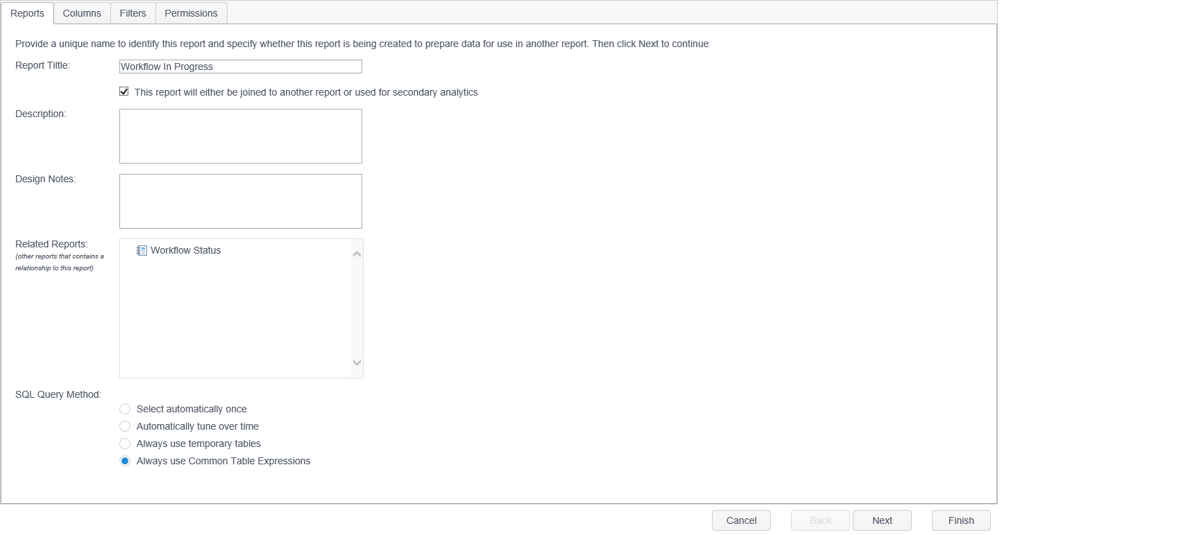 The Report Tab of the Report Wizard is used to define the title of the report and provide an optional description and design notes for the report which are used only as reference information in the wizard. It also displays any related reports that are joined to the report being edited, and optionally allows you to select the SQL Query Method used to generate the report.