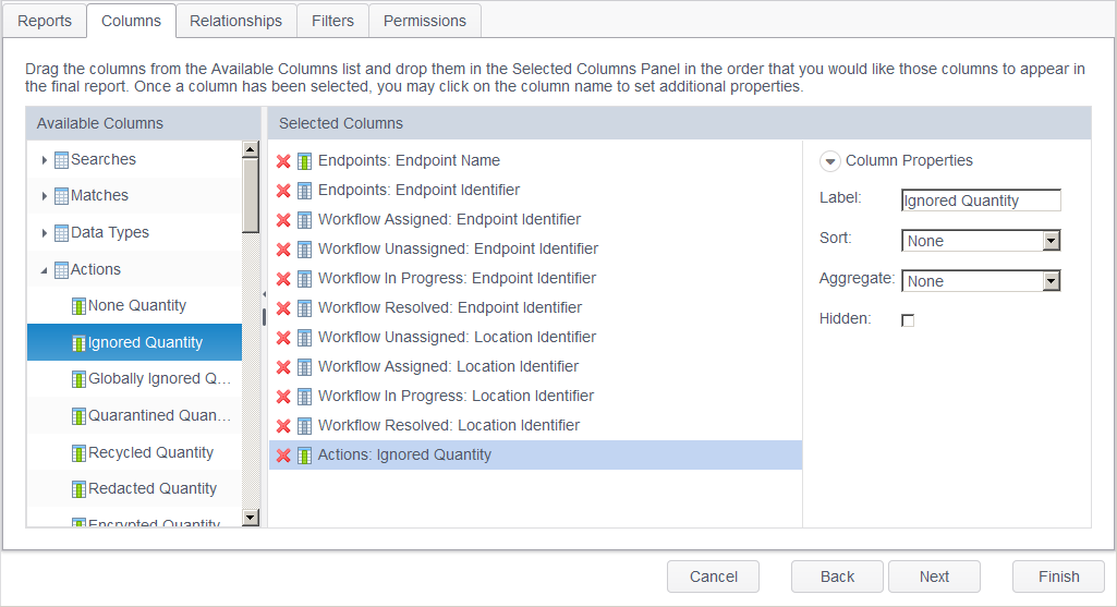 The Columns tab of the Report Wizard allows you to add and remove columns from a report; set the labels that appear in the report; and specify sorting, aggregation, and formatting, as applicable.