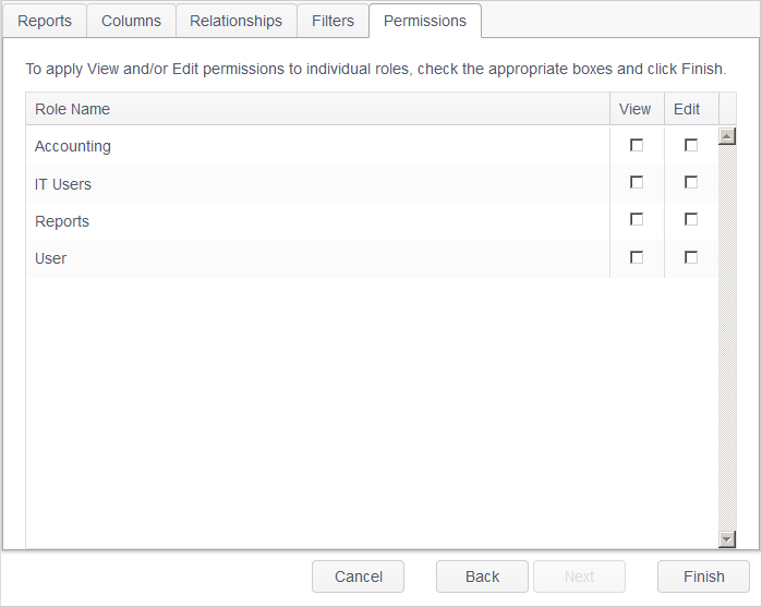 The Permissions tab of the Report Wizard allows you set View and/or Edit permissions to specific roles.