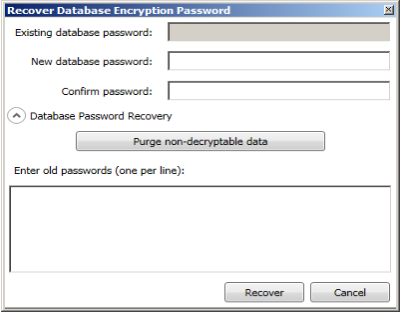 | Change Database Encryption Password... | Use this button to reset the database encryption password configured during the initial Console installation or to recover data that may have been encrypted with multiple, different passwords.![]() Enter your current encryption password in the Existing database password field. In the New database password and Confirm password fields, enter the new encryption password. If Database Password Recovery is required, enter all old passwords, one per line. Also, enter the password secret, which may be necessary in cases where the installation process fails prematurely. When ready, click the Recover button. The duration of the recovery process depends on the amount of encrypted data and may take from anywhere from a few minutes to several hours. The recovery process must not be interrupted; doing so will likely cause data loss. If data recovery is not desired, click the Purge non-decryptable data button to purge all data that cannot be decrypted by the current password. |