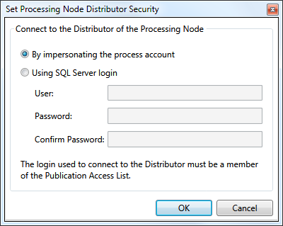 This button opens a dialog where you can specify how to connect to the distributor of the processing node. The connection can be made by impersonating the Microsoft Windows account or under the context of a Microsoft SQL Server account that you specify. (Note: This button is only displayed if you chose to replicate your database prior to installation of the Console.)