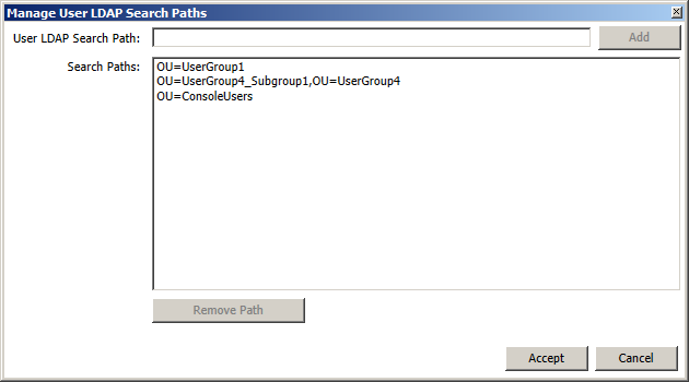 | Specify User LDAP Search Paths | This allows you to add specific OU paths to search for user accounts to log in to the Console. The OUs listed here, if any, are the only ones searched when populating the Users page. If no OU paths are selected, then the entire AD structure is searched for user accounts. The format for LDAP Search Paths is the AD based simple path relative to the root of the AD but not including the root information such as the domain, for example "OU=UserGroup1". If there is a more complex path, such as a subgroup, just list the simple path in bottom up order, for example if the AD directory tree displays UserGroup4\UserGroup4_Subgroup1, the path would be "OU=UserGroup4_Subgroup1,OU=UserGroup4". LDAP paths are immediately verified and prompts appears if the OUs cannot be found. To enter paths click on the Specify User LDAP Search Paths button, and then when the Manage User LDAP Search Paths dialog appears type in a search path and click the Add button:![]() |
