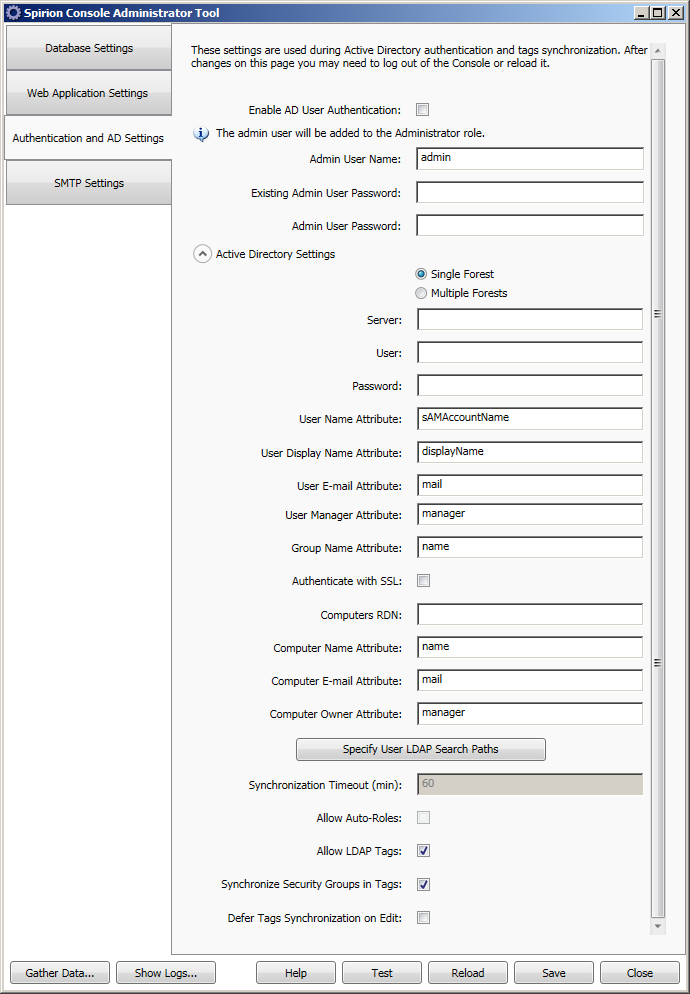 | Multiple Forests | Multiple Forests, if enabled, allows you to work in active directories across multiple servers which allows you to synchronize AD users, tags, tasks, and roles. When Multiple Forests is enabled, then the Admin account that is specified should either be done in the format ldap://server.idf.local:389/CN=John Smith,CN=Users,DC=idf,DC=local or the username attribute can be set to userPrincipalName and the account name can take the format jsmith@idf.local. |