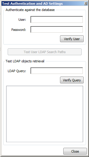 Use this button to test the authentication settings. A test dialog displays requiring further configuration information. Once the additional configuration information is provided click the Verify User button to test a user account or the Verify Query button to test an Active Directory LDAP query. Any errors are displayed if the user or query verifications fail. The test dialog requires the following information: