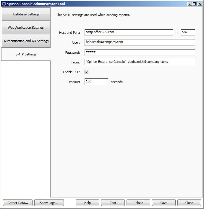 The SMTP Settings tab displays settings for configuring SMTP for the Console. Configuring SMTP settings provides the information required to send out reports via email. Once the settings are configured users are able to configure reports to be emailed as described in the Export section of the Report List Group, and is also able to configure Workflow Rules Notifications.