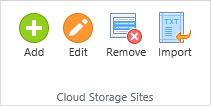 Cloud Storage Sites: Appears when editing policies and Cloud Storage Sites is selected to allow adding, editing, removing, and importing of specific cloud storage sites to include in a search. |