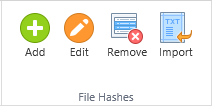 File Hashes: Appears when editing policies and File Hashes is selected to allow adding, editing, removing, and importing of specific file hashes to include in a search. |