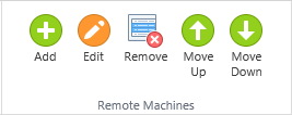 Remote Machines: Appears when editing policies and the Remote Machines Location is selected to allow adding, editing, and removing machines to include in a search. Also allows changing of the order in which the machines will be searched. |