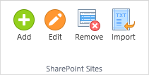 SharePoint Sites: Appears when editing policies and the SharePoint Sites Location is selected to allow adding, editing and removing of SharePoint sites to include in a search. |