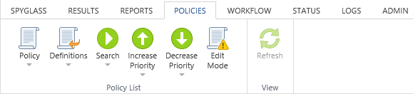 - View: Allows the policy list to be refreshed to display new data. Additionally, when editing Settings, allows the settings list to be filtered and managed.