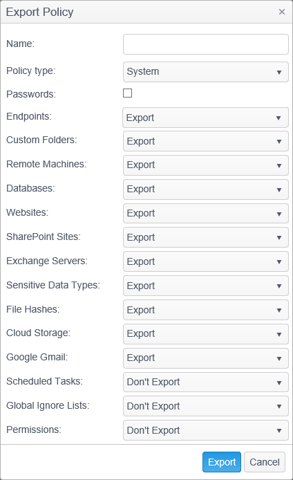 | Sensitive Data Types | Select Export and any Sensitive Data Types (Keyword, Regular Expression, Dictionary, Search API, Sensitive Data Definition) you have applied to the selected policy are included in the XML file. Select Don't Export and the Sensitive Data Types are not exported. |