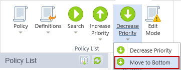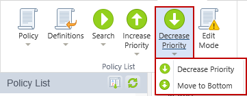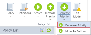 Changes the priority of the selected policy to be lower than the policy below it in the Policy List. The policy at the top of the list has the highest priority and the policy at the bottom of the list has the lowest priority. For any conflicting settings in policies that apply to the same endpoint, the setting from the policy with the higher priority is used. Note: The Decrease Priority button is disabled when policies are sorted by name.