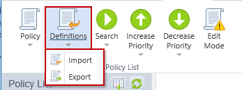 The Definitions button allows you to import or export the definition of a policy in xml format. A policy definition contains the settings and search locations of the selected policy. A policy can be exported as an xml file to be imported into another Console server. The most common scenario for exporting and importing policies is when moving policies from a staging/test Console to production.