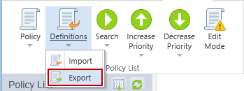 To export policy definitions to an XML file, select Export to display the Export Policy dialog.