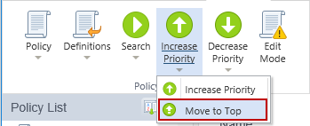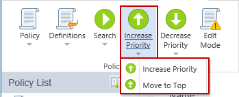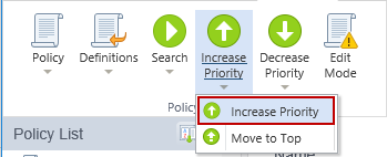 Change the priority of the selected policy to be higher than the policy above it in the Policy List. The policy at the top of the list has the highest priority and the policy at the bottom of the list has the lowest priority. For any conflicting settings in policies that apply to the same endpoint, the setting from the policy with the higher priority is used. Note: The Increase Priority button is disabled when policies are sorted by name.