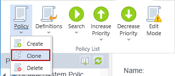 The cloned policy includes the Settings and Search Locations of the original policy. To clone a policy, you must first select the policy that you want to duplicate by left clicking on the policy name, then click the Policy button and select Clone.